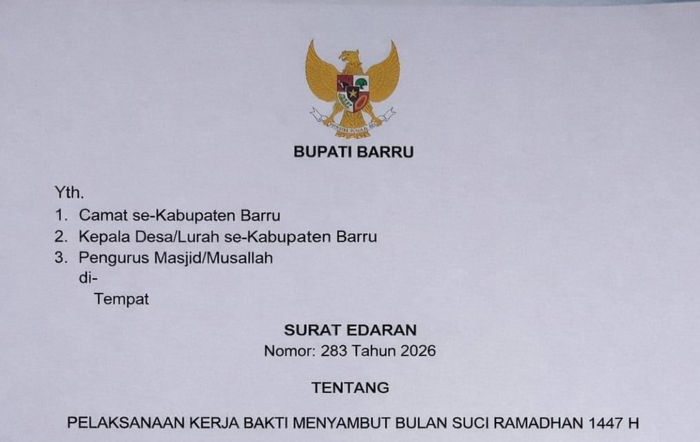 Barru, TrapesiumNews.Com – Pemerintah Kabupaten Barru menerbitkan Surat Edaran Nomor 283 Tahun 2026 tentang Pelaksanaan Kerja Bakti Menyambut Bulan Suci Ramadhan 1447 Hijriah. Surat edaran yang ditandatangani Bupati Barru, A. Ina Kartika Sari, pada 13 Februari 2026 tersebut ditujukan kepada para Camat se-Kabupaten Barru, Kepala Desa/Lurah, serta Pengurus Masjid dan Mushallah.